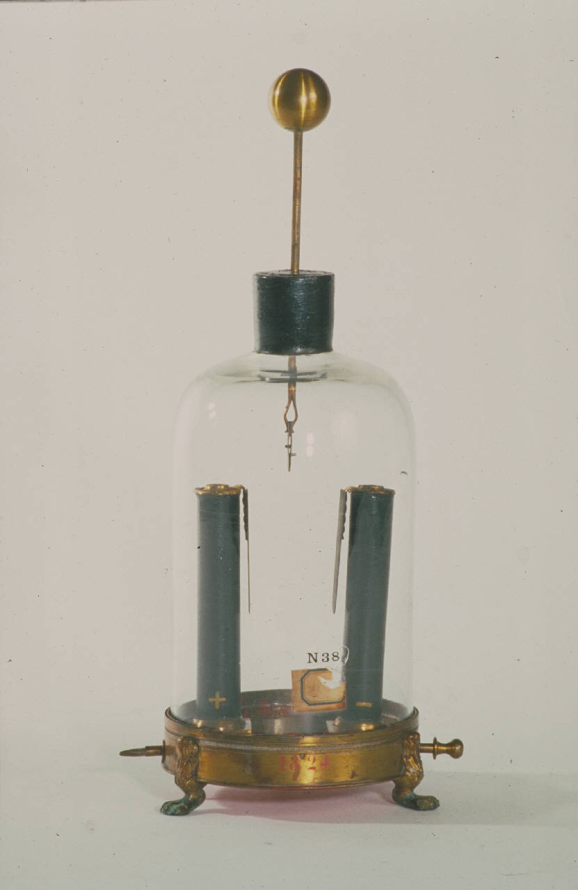Lo strumento è costituito da una base di ottone circolare con piedini zoomorfi che sostiene una campana di vetro chius da un tappo di materiale isolante. Sotto la campana, appoggiate alla base, si trovano due pile a secco cilindriche di tipo Zamboni che tramite due sbarrette, poste agli estremi di un diametro della base, possono essere avvicinate o allontanate. Osservando il dspositivo si può notare che le sbarrette laterali sono differenti in quanto una termina in modo arrotondato mentre l'altra a punta; questa differenza tuttavia è apparente in quanto se vengono sfilate dallo strumento, si dimostrano essere uguali e atte allo stesso scopo, variare la distanza tra le due pile. La barretta terminante a punta ha perso la parte finale di forma arrotondata. Questo dispositivo permette di variare la distanza tra i piattelli entro cui è sospesa la foglia d'oro e quindi variare la sensibilità dello strumento. La mobilità delle pile è sostanzialmente possibile se dall'interno della base viene rimosso il disco di materiale resinoso presente. Quest'ultimo venne inserito solo in seguito per bloccare le pile stesse. Le due pile risultano essere disposte verticalmente poggiandosi sulla base ed in modo che i poli superiori abbiano polarità opposte. I due poli delle pile sono costituiti da due lamelle metalliche, disposte anch'esse verticalmente, che si affacciano tra le pile. Attraverso il tappo isolante della campana passa un'asta di ottone, che all'esterno termina con una sferetta anch'essa di ottone e all'interno con una pinzetta; questa originariamente sosteneva una foglia d'oro, attualmente mancante, che pendeva tra i piattelli metallici collegati ai poli delle pile.