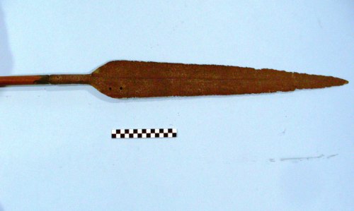 lama a fiamma, con tipica sezione a losanga "disassata", senza nervatura centrale. Tracce di incisioni geometriche (tipiche) al codolo. Due piccoli fori sulla lama. Asta non originale.